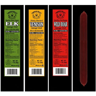 - 12 sticks each of Elk, Venison, Wild boar – no MSG or trans fats, and gluten-free