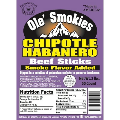 Our Buffalo Bills Chipotle Habanero Ole’ Smokies are a great choice for those who enjoy an all-beef stick with extra heat. These premium 5″ beef sticks come packed 50 sticks per 2-lb saddlebag. Proudly made in the USA with US-raised beef. Introduced in 2001, our line of Ole’ Smokies continues to be a nationwide hit with customers of all ages. Customers love their old-fashion quality and soft meaty texture (similar to a summer sausage). Buffalo Bills Ole’ Smokies Saddlebags are available in 5 distinctive flavors – Chipotle Habanero, Honey Stung, Mild, Spicy, and Teriyaki.