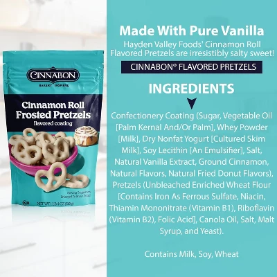 Experience the comforting taste of a bakery favorite with Hayden Valley Foods Cinnabon Bun Covered Pretzels. Each crunchy pretzel is coated in a smooth, sweet cinnamon bun flavored yogurt for a perfectly balanced sweet and salty snack that captures the indulgent flavor of a classic Cinnabon treat.