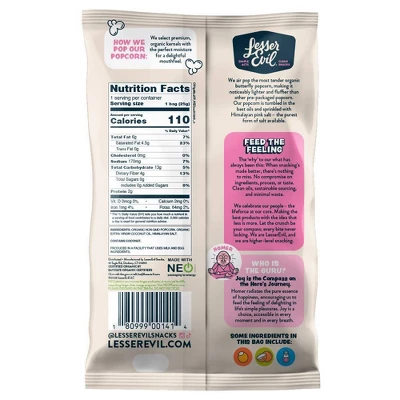 - This .88 oz bag of LesserEvil Organic Popcorn, Himalayan Pink, is just 100 calories per serving, making it a satisfying snack you can still feel zen about. Packaging may vary.
