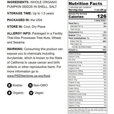 Organic Pumpkin Seeds in Shells serve as a great snack just as they are, provide you with a large serving of fiber and protein, as well as several vitamins and minerals. But most importantly, they are delicious and easy to prepare, especially by roasting and seasoning. Pumpkin seeds, aka pepitas, have a distinct rich nutty flavor, that allows them to stand out and be one of the top products in our store. It also makes them an excellent addition to many dishes, particularly salads and baked foods. How to Enjoy Organic Pumpkin Seeds in Shell. Snack on pumpkin seeds in front of the TV or enjoy them with friends over drinks, on a hot summer day. If you do have the time to shell the seeds, you can gently crush the seeds under a rolling pin and place them into boiling water for about five minutes. Cracked shells will peel off, and once the seeds dry, you’ll be able to enjoy them any way you like. Try sprinkling on salads or add to lentil soups. Making pumpkin seed butter is also a great idea and sure is fun. How about Organic salted and roasted whole pumpkin seeds for a more sophisticated snack? Add spices you like to give seeds more flavor, although roasting will enhance the natural taste of the seeds so they will be amazing even without seasoning. How to Store Organic Pumpkin Seeds in Shell Whole pumpkin seeds are easy to store as you only need to make sure that they kept dry and to prolong shelf-life, keep them somewhere cool. Note that they will quickly go rancid if you keep the seeds near to heat sources or in a climate with a lot of moisture.WARNING: Consuming this product can expose you to chemicals including Acrylamide which is known to the State of California to cause cancer and birth defects or other reproductive harm. For more information go to www.P65Warnings.ca.gov/food