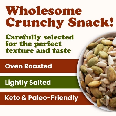 Sunflower and pumpkin seeds are packed with essential nutrients that contribute to a balanced diet. Sunflower seeds are a great source of vitamin E, an important antioxidant, while pumpkin seeds provide magnesium, zinc, and iron. Both seeds contain plant-based protein, heart-healthy fats, and dietary fiber, making this mix an excellent option for a nutrient-dense snack. The light salt enhances the natural flavor without overpowering the nutritional benefits.