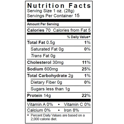 Wild Bills Black Peppered Beef Jerky 30-ct Strips. Packed in a 15oz vacuum packed bag, Wild Bill’s Black Peppered Beef Jerky Strips are a whole muscle beef jerky marinated in soy sauce and seasonings then kicked up a notch with a healthy dose of cracked black pepper – hand strung and smoked in a real smokehouse. Each bag has approximately 30 strips (5″ to 6″ in length), but you’ll always get 15oz of old fashioned flavor in every bag! Wild Bill’s Black Peppered Beef Jerky has only 2 carbs and 70 calories per 1oz serving – gluten free and contains no MSG.